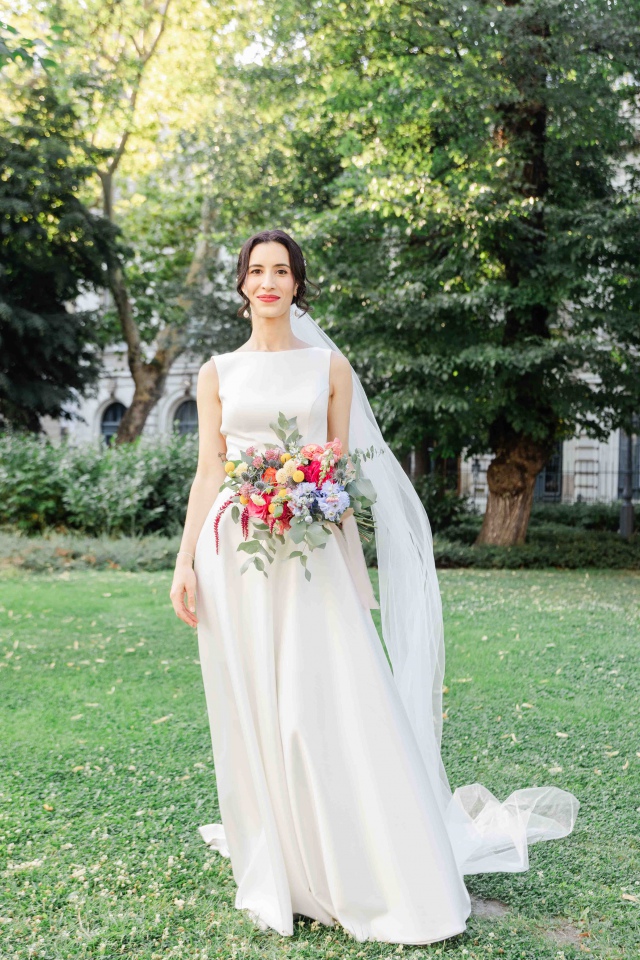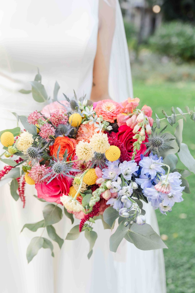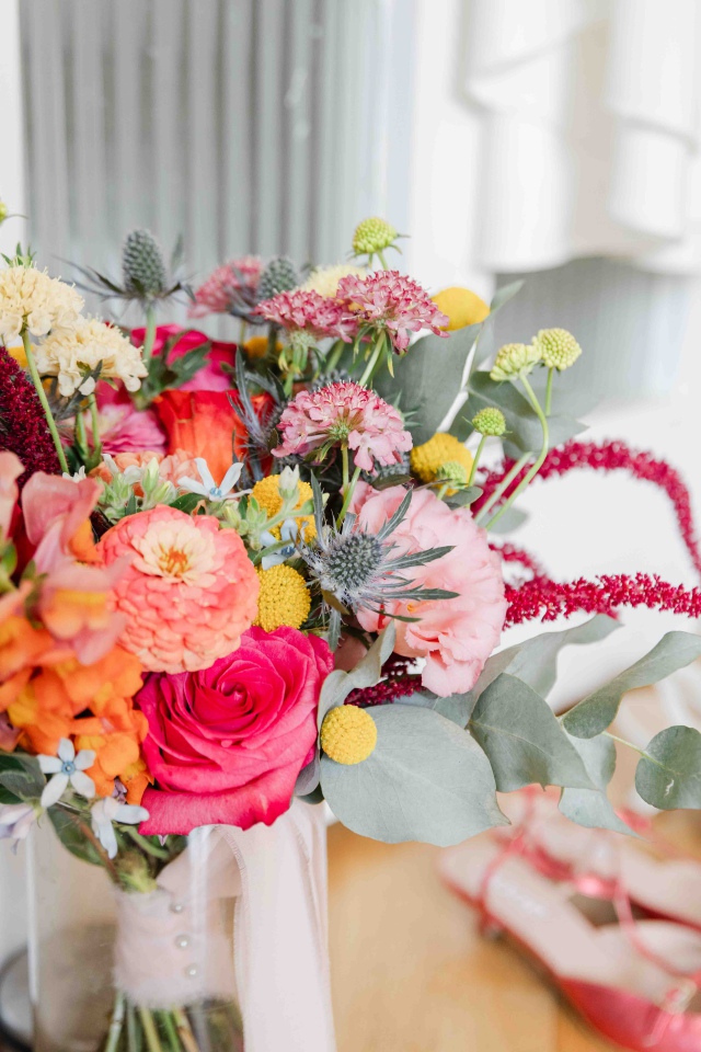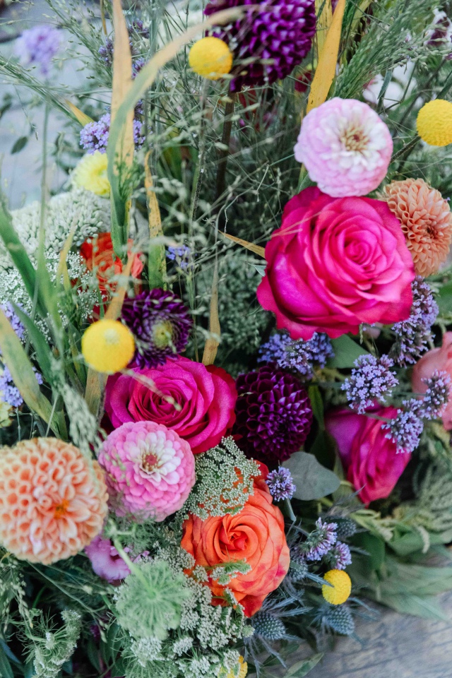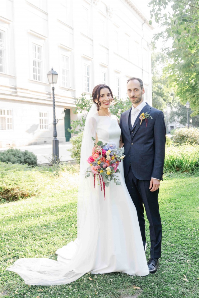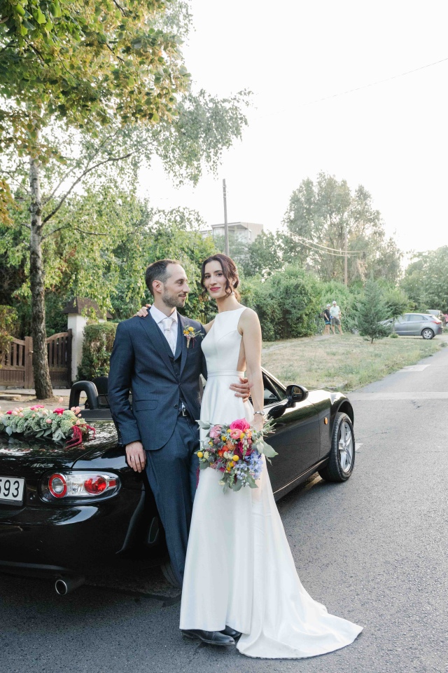 Dianaék esküvőjén is pont ilyen vibrálóan üde színeket használhattunk a dekorációban. Én kimondottan szeretem, amikor bátran lehet nyúlni a színekhez és nem csak a pasztell árnyalatok érvényesülnek a dekorációban. Nagyon szerettem ezekkel a virágokkal dolgozni. A koncepció az volt, hogy picit megidézzük a nyári mezők hangulatát a rendezvénysátorban. Diana csokra is ebben a hangulatban készült, idén azt hiszem a kedvenc csokrom volt.