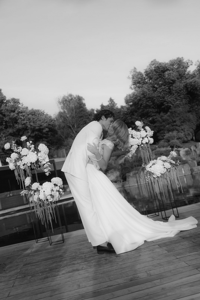 A szabadtéri szertartás dekorációja az esküvő egyik leglátványosabb eleme volt. A Zen Garden kertjében található kis mesterséges tó partjára álmodtuk meg a ceremónia helyszínét, ahol a virágtartókon elhelyezett, nagy méretű, lecsüngő virágkompozíciók szinte lebegtek a térben. A légies, romantikus virágdekor tökéletes összhangban volt a környező természettel.