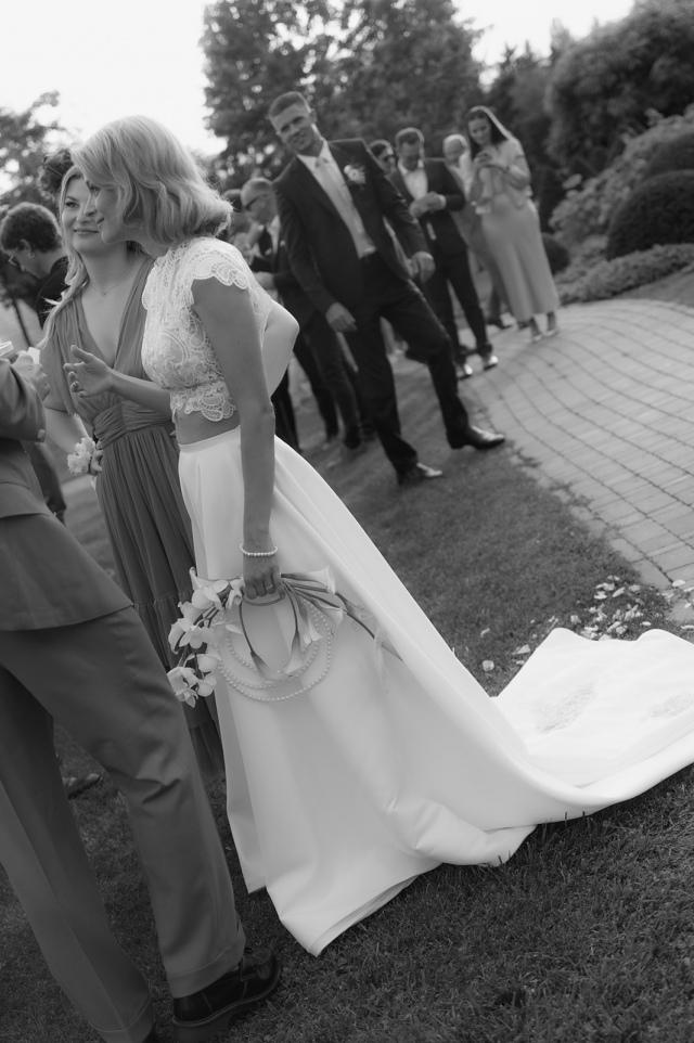 Lili menyasszonyi „csokra” igazi különlegesség volt: nem hagyományos csokor, hanem egy finom, ékszerszerű alkotás. Gyöngyökre fűzött kálák, orchidea és egy szál Anthurium alkotta ezt az egyedi menyasszonyi kiegészítőt, amely finomságával és törékenységével tökéletesen tükrözte Lili személyiségét.